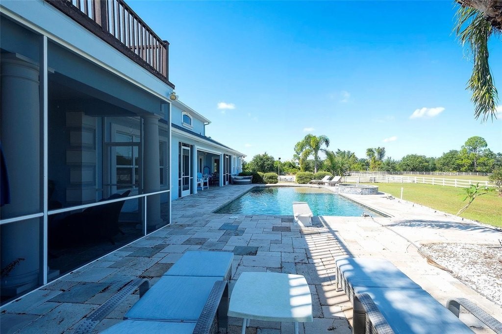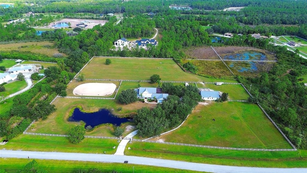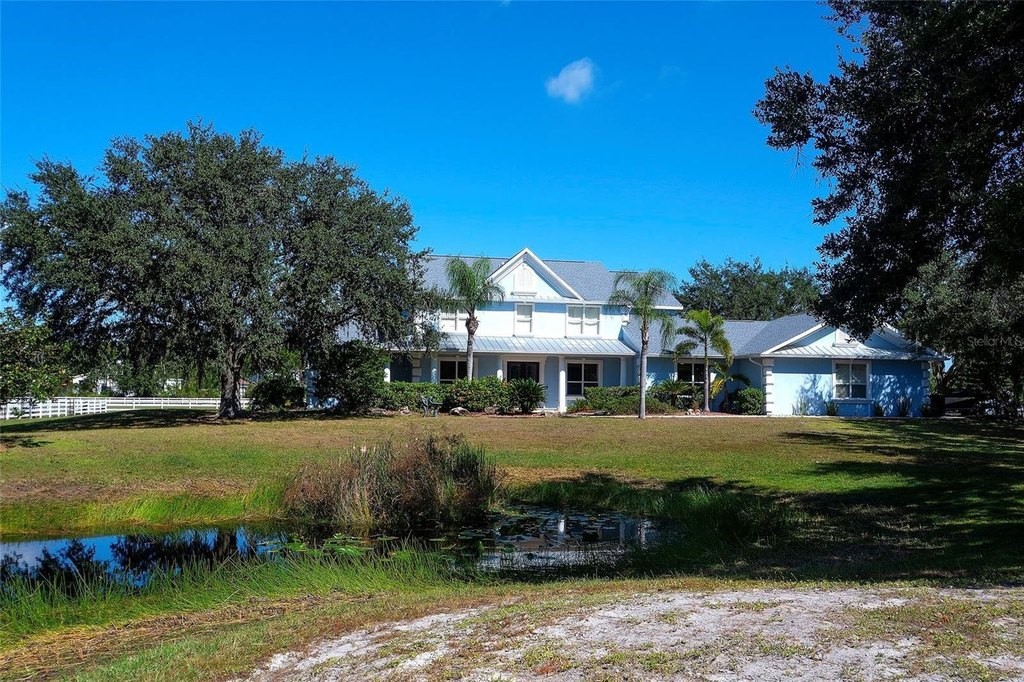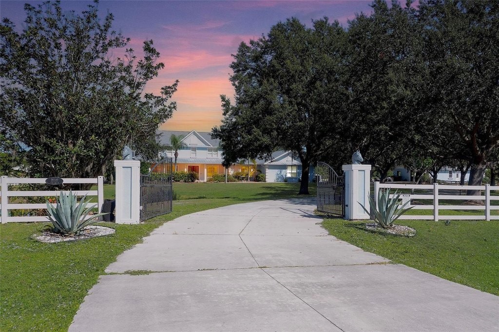 Gated and completely fenced, this elegant traditional home is in the highly sought after neighborhood of Foxwood in Panther Ridge. Its storm ready and perfectly positioned in Zone X, sitting high and dry, with no flood insurance required. Adding to your peace of mind, the house and barn have new roofs in 2025, each with a transferrable warranty. This country estate offers enduring craftmanship. Arrive through the automatic gate to the oak tree lined driveway. The view of pasture and block barn on right and pond on left make for beautiful curbside appeal. Step onto front porch and enter the marble foyer. Once inside you will find an impressive gourmet kitchen with cherry cabinetry, Cambria quarts, a 6 burned DACOR gas range, Sub-Zero refrigerator, Miele dishwasher-ideal for those who love to cook. The kitchen is light and airy with breakfast bar and plenty of room for table to view the saltwater pool with Baha shelf. The first-floor primary suite features a gas fireplace, spa-inspired bath with Mr. Steam shower and brass clawfoot tub, and custom closets with locking cabinetry. The great room has 20-foot ceilings, gas fireplace, marble floors and poplar built-ins open to a screened lanai with an automatic shade for effortless indoor-outdoor living. Additional rooms on first floor are spacious dining room, office, and private bedroom with ensuite bath. Featured upstairs is a large bonus room with bar connecting to a TREX deck overlooking pool with generous travertine surround. Two additional bedrooms and bathroom complete the second floor. The block barn designed with 4 stalls, individual turnouts, automatic fly system, fans, tack room, feed room, wash racks, and RV outlets. The barn offers infinite flexibility and could be converted into a guest house, workshop, or space for a car collector. Both the home and barn feature Miami-Dade hurricane rated windows and doors. For year-round comfort and security, a 30KW Generac generator and Martin garage doors have been installed. It is important to note that Panther Ridge offers miles of groomed private trails with bridges, oak hammocks, pine forests. Horseback riding, hiking and biking are allowed with no motorized vehicles to disturb the beauty of Mother Nature. Panther Ridge is a prime location for the Florida country living lifestyle. The serene setting and proximity to hospitals, schools, shopping, sports parks and only 8 miles from I-75. Bordering on the West side of the community is The Concession Golf Club designed by Jack Nicklaus and Gary Player. Don't miss the opportunity to live and enjoy this home in a unique setting. Places like this are not being built with everything this extraordinary home and property have to offer.